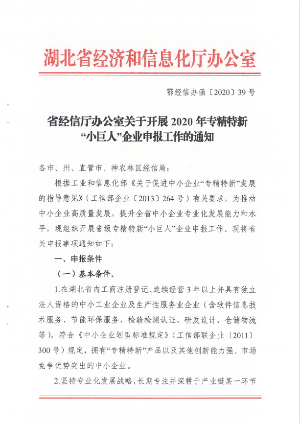 關(guān)于組織申報(bào)2020年湖北省專精特新“小巨人”企業(yè)的通知